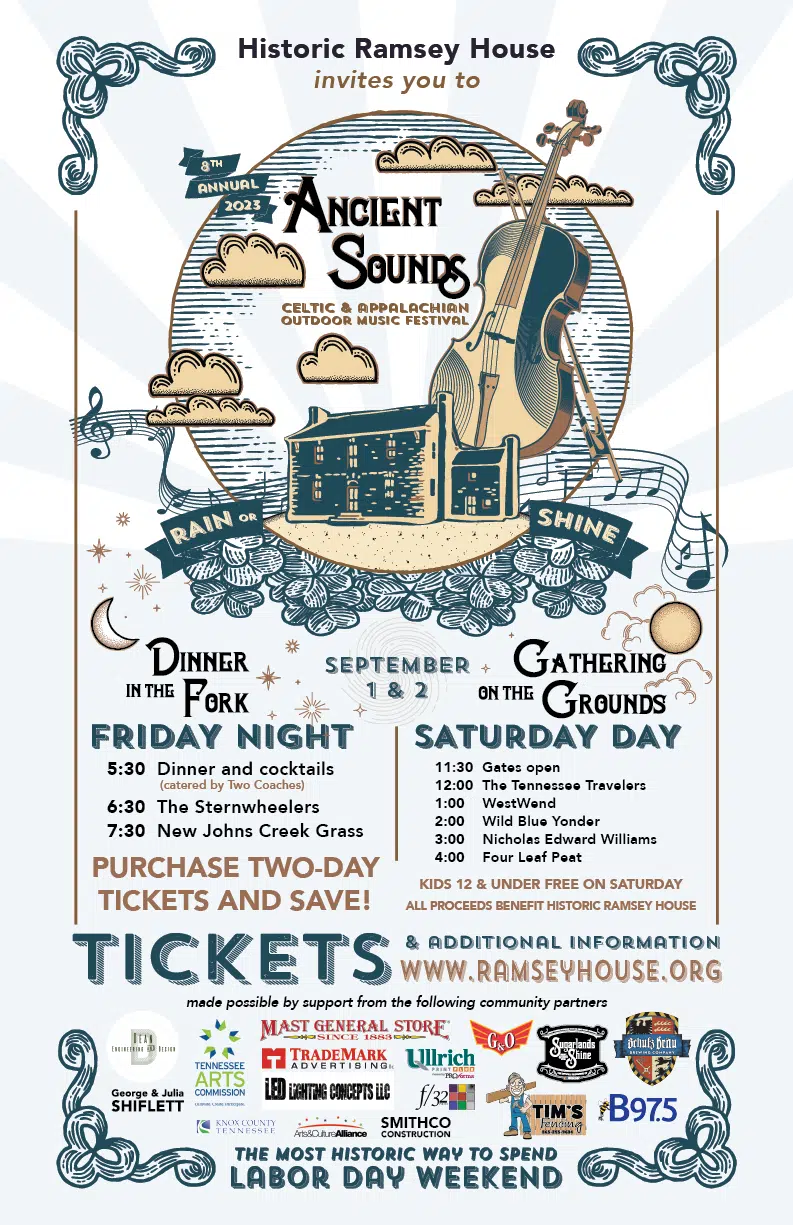 September 1 and 2, 2023 Ancient Sounds - a two-day music event that celebrates the rich musical traditions of the Celtic and Appalachian musical roots of our region. Set against the picturesque backdrop of the Historic Ramsey House in Knoxville, Tennessee, this unique festival offers an opportunity for visitors to be immersed in captivating melodies and foot-stomping rhythms as talented musicians and performers transport you to a bygone era. Experience the soulful tunes of Celtic music, resonating with ancient melodies and haunting ballads and then delight in the vibrant sounds of Appalachian music, deeply rooted in our East Tennessee history.